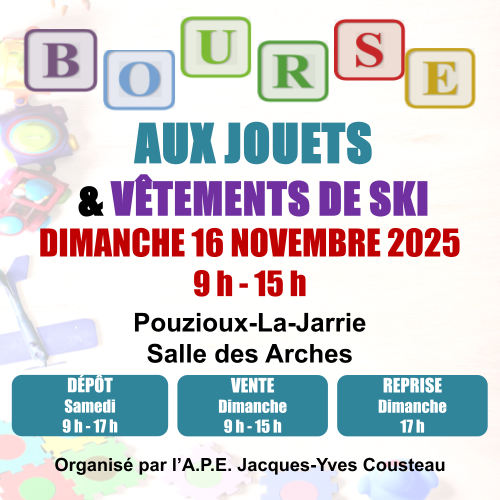 L’APE Jacques-Yves Cousteau organise une bourse aux jouets et aux vêtements de ski.