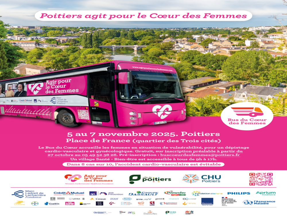 Le BUS Cœur des Femmes passe à Poitiers les 5, 6 et 7 novembre. C’est une grande opération itinérante d’information, de sensibilisation et de prévention sur les maladies cardio-vasculaires et gynécologiques. L’objectif est de déployer un dispositif de dépistage équipé partout en France et au-delà, ainsi que d’aller à la rencontre des femmes en situation de vulnérabilité.
