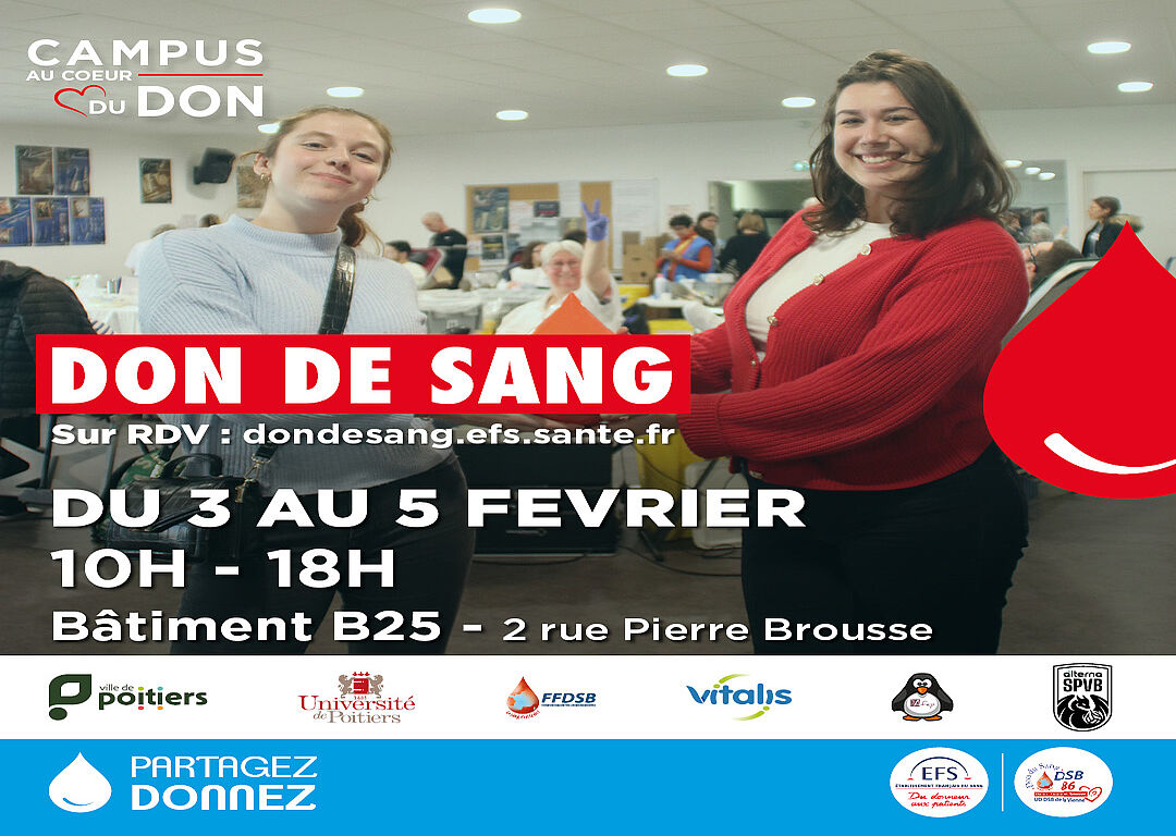 Dans le cadre de l’opération Campus au Cœur du Don, l’Université de Poitiers accueille une collecte de sang exceptionnelle du 3 au 5 février 2026.