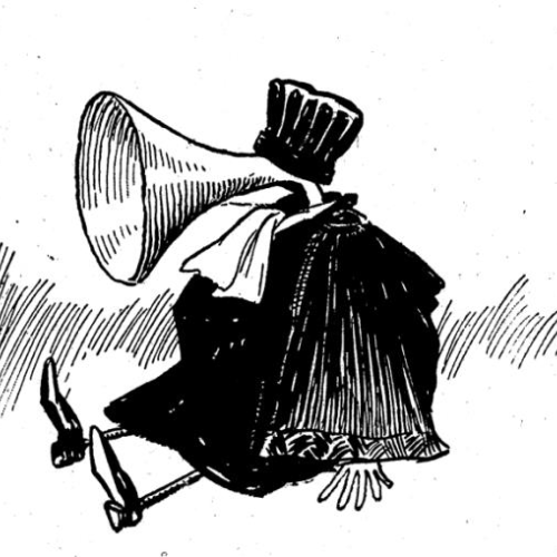 Caricature représentant un homme dont la tête prend la forme d'un clairon