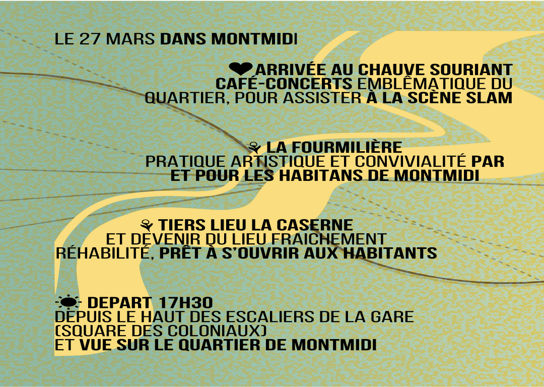 RDV le 27 mars de 17h30 à 20h30 pour aller se balader dans le quartier de Montmidi et y découvrir ses pépites alternatives.