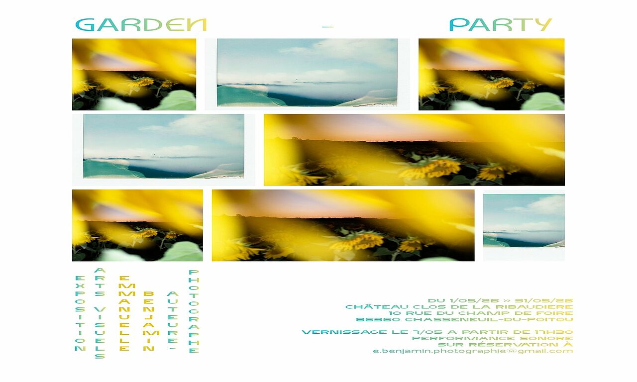 Le jardin est un motif iconographique dans l'histoire de l'art. Pour cette exposition d'arts visuels intitulée "Garden Party", l'auteure-photographe Emmanuelle BENJAMIN investit les lieux du Château du Clos de la Ribaudière et propose ses "jardins" oniriques ! Ils prennent place aux côtés de celui du Clos. Les "jardins" composés par l'oeil de l'artiste proviennent d'espaces naturels qui lui sont environnants (Vienne, Gironde, Charente-Maritime...) et souvent "prélevés" dans des écosystèmes fragiles (zones humides, réserves naturelles, etc.) . Quand l'humain fait son apparition, c'est toujours en lien avec ce vivant. Néo-pictorialiste, artiste du vivant, Emmanuelle BENJAMIN est issue d'un parcours hybride et développe une écriture photographique singulière.