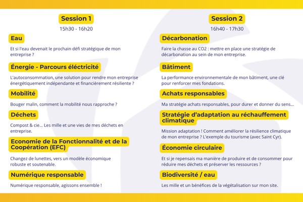 - 15h30 - Deux sessions d'ateliers : mini-conférence, serious-game, ateliers coopératifs sur 12 thématiques.
