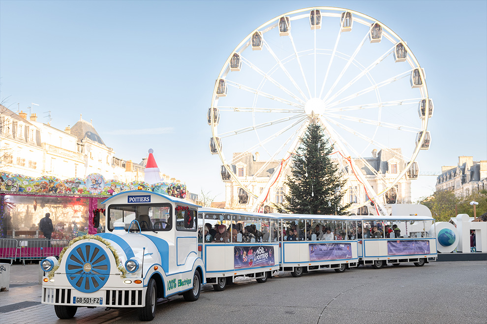 Offert par l’Office de tourisme de Grand Poitiers, le petit train de Noël vous emmène d'un lieu à un autre, pour admirer les décorations de Noël ou vous déplacer facilement et gratuitement.