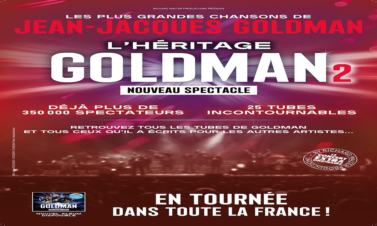 Découvrez le nouveau spectacle époustouflant de « L’HÉRITAGE GOLDMAN 2 », où les tubes intemporels de Jean-Jacques croisent les plus belles chansons qu’il a écrites pour les plus grandes voix de la chanson Française telles que Céline Dion, Johnny Hallyday, Patricia Kaas, Khaled et Florent PAGNY.