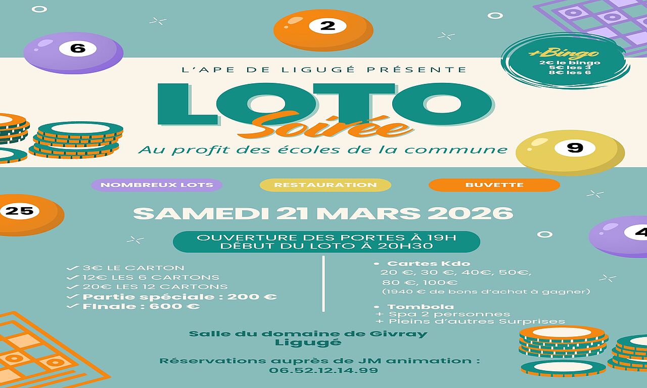 L'Association des Parents d'Élèves de Ligugé vous invite pour une soirée loto conviviale orchestrée par JM Animations : 1 940 € de bons d'achats à gagner (carton final à 600 € !) et tombola d'exception avec un spa et plein d'autres lots !