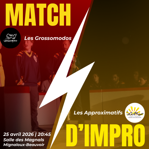 Les Approximatifs (Mignaloux-Beauvoir) affrontent les grossomodos (Orléans) dans un match d'improvisation 100% déjanté. Thèmes improbables, personnages absurdes et punchlines sorties de nulle part : Tout est créé en direct, sous vos yeux. Venez rire, vous divertir, voter et faire pencher la balance dans ce duel où l'imagination n'a aucune limite ! Tout public. Accès handicapé. Accompagnement musical. Buvette sur place sans restauration.
