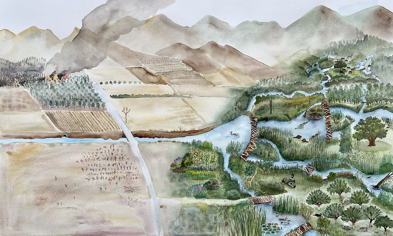 À quoi ressemblaient nos paysages d’antan, quand les rivières étaient foisonnantes de vies ? C’est ce que nous révèle l’artiste franco-américaine Suzanne Husky. Via une série d’aquarelles époustouflantes, elle revient sur le rôle crucial d’un ingénieur des rivières sous-estimé : le castor. Diplômée des Beaux-Arts de Bordeaux, formée en paysagisme et en agroécologie, Suzanne met son art au service de la régénération des écosystèmes, et nous interroge sur notre relation aux zones humides. À travers des œuvres dignes des plus beaux folklores et contes d’autrefois, mais aussi des actions de terrain, Suzanne nous apprend à imiter les castors pour "Rendre l’eau à la Terre "et restaurer les cours d’eau. Texte de Laurie Debove.