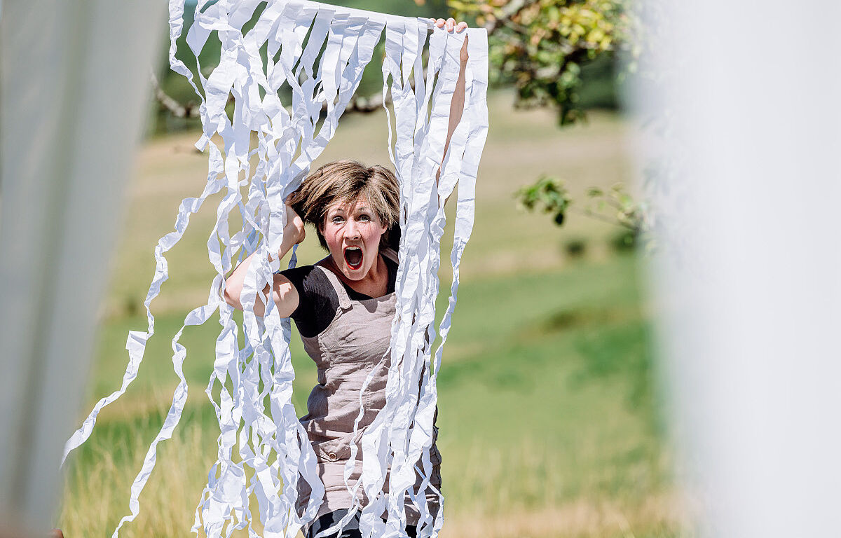 Sur scène, une valise. Une valise et c’est tout. Cette valise, c’est le guide qui amène à explorer autre chose, autrement. Rester ici et partir faire le tour du monde. Explorer tout un monde en soi, c’est l’invitation lancée à notre imaginaire. Charlotte nous invite à partir en voyage. Avec le papier, elle nous emmène parcourir mille paysages, un univers fait de blanc où tout est permis. Cheminant de surprise en poésie aux vibrations de l’accordéon, le spectateur prend les commandes : « Et maintenant, on va où ? ». Le temps est suspendu, une énergie presque magique plane dans la salle. Des cartes dessinées sortent de la valise et c’est au public d’écrire le déroulement de l’histoire.