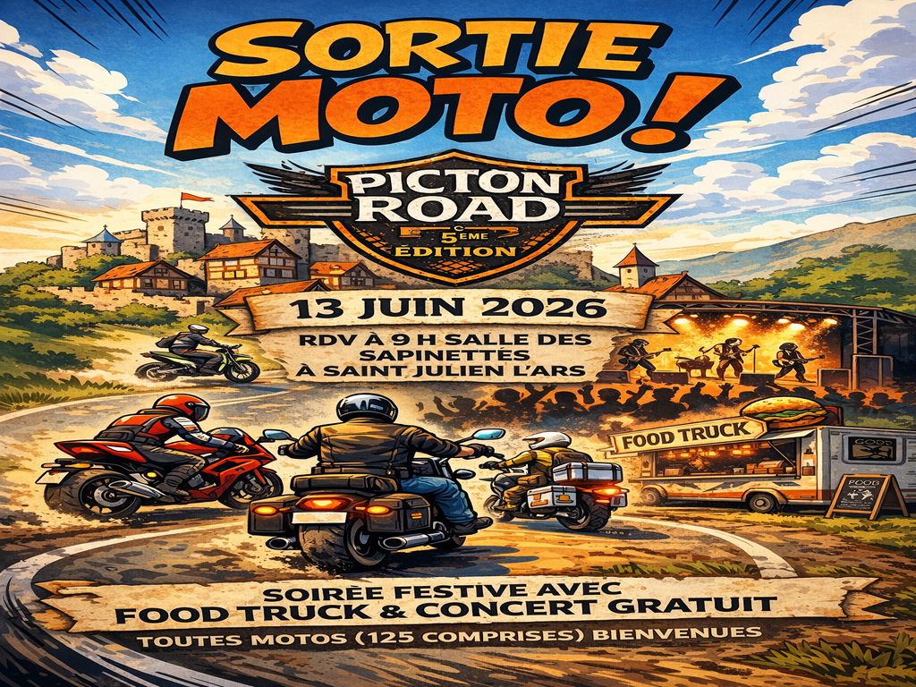 Sortie moto encadrée à la journée d'environ 240 km direction plein est. Pique-nique du midi à apporter avec visite libre d'une cité médiévale. Soirée festive à la salle des Sapinettes à partir de 19 h avec foodtruck et à 20 h concert gratuit poprock du groupe "Innersun".