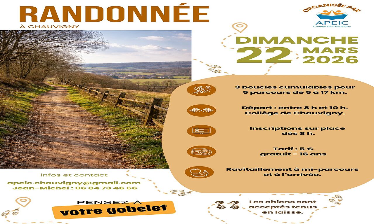 L'Association des Parents d'Elèves Indépendante au Collège (APEIC) organise une randonnée pédestre à Chauvigny le dimanche 22 mars 2026 au départ du collège Gérard Philipe, de 8h à 10h.