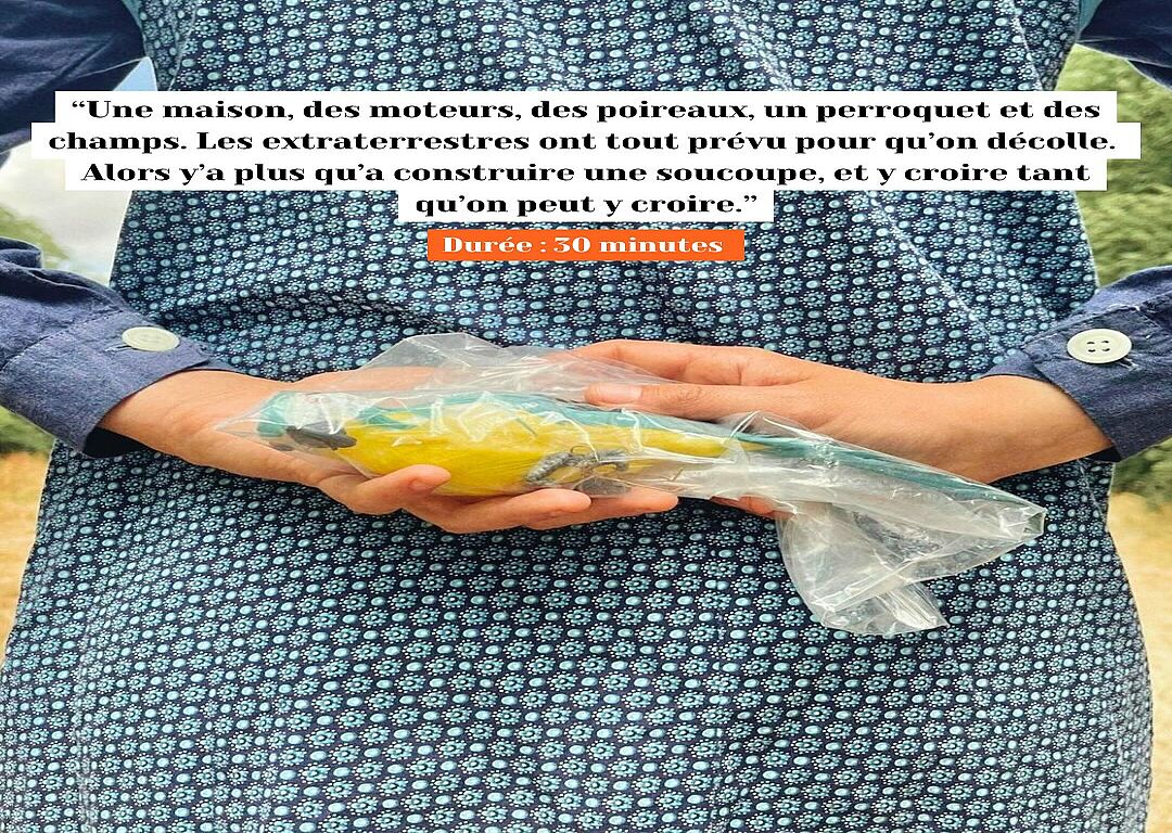 Soucoupe, spectacle de Chimène Siredey avec Sacha Roy Girard, Hugo Guyot, Chimène Siredey et Loona Jamet. Porté par la compagnie La Carriole. Une maison, des moteurs, des poireaux, un perroquet et des champs. Les extraterrestres ont tout prévu pour qu’on décolle. Alors y’a plus qu’a construire une soucoupe, et y croire tant qu’on peut y croire.